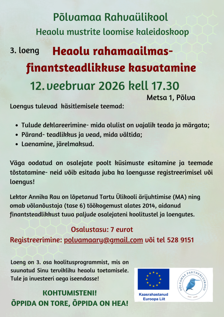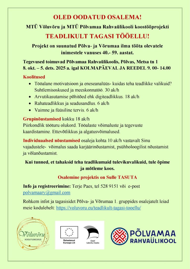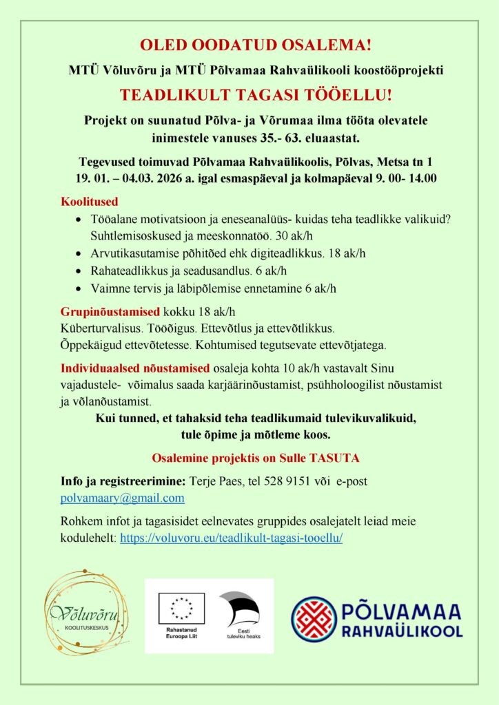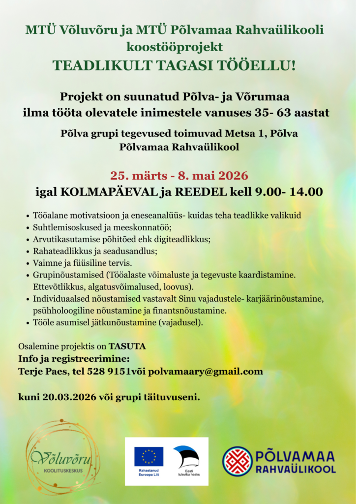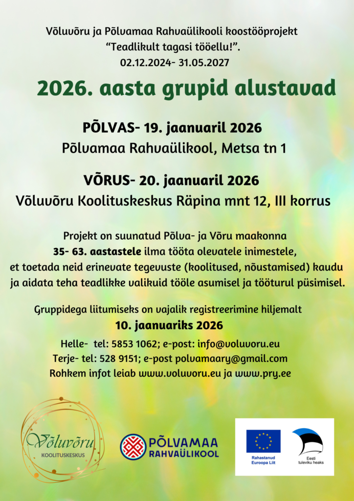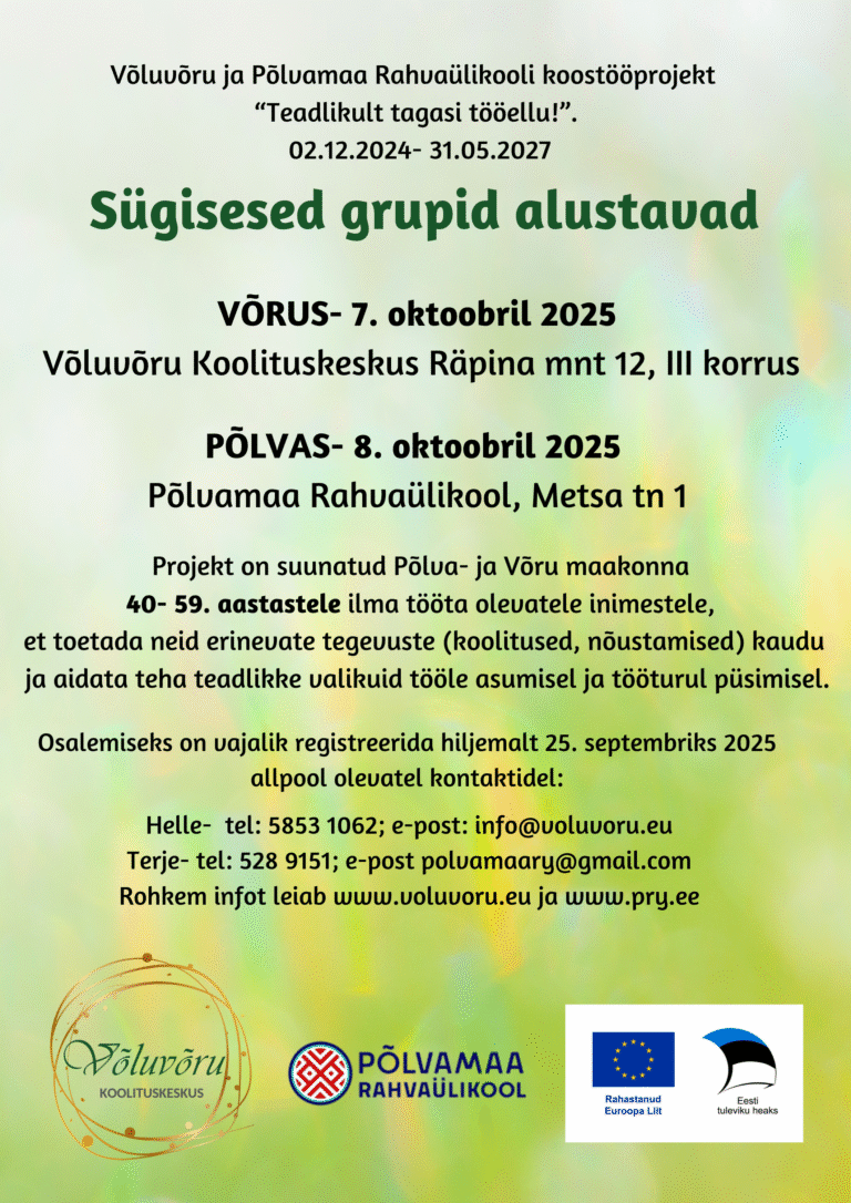 MTÜ Võluvõru ja MTÜ Põlvamaa Rahvaülikooli koostööprojekt sai positiivse rahastusotsuse projektile “Teadlikult tagasi tööellu!”.
